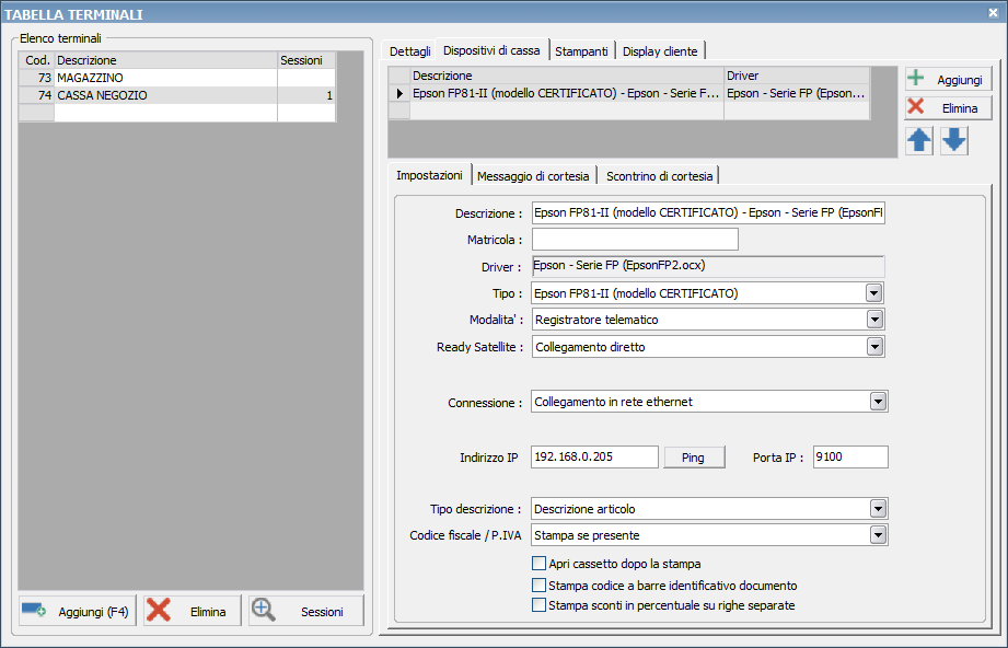 Tramite questa procedura è infatti possibile configurare, per ogni terminale, uno o più registratori di cassa collegati.