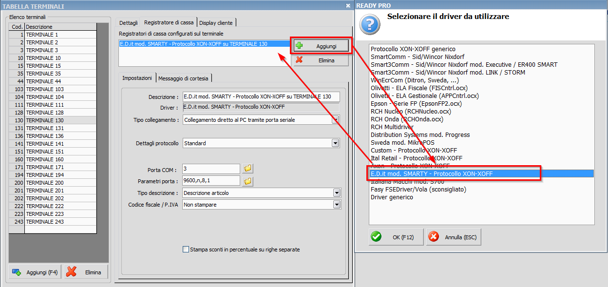 Ready Pro integra nativamente un driver interno per l'interfacciamento tramite porta seriale con i registratori di cassa E.D.it Smarty (in modalita' XON-XOFF)