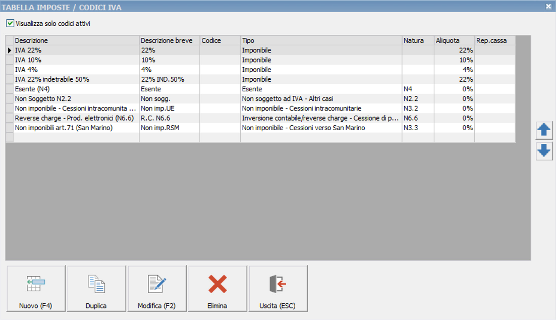 Tramite questa tabella si possono creare i vari codici IVA ed i codici esenzione da utilizzare su documenti e listini.