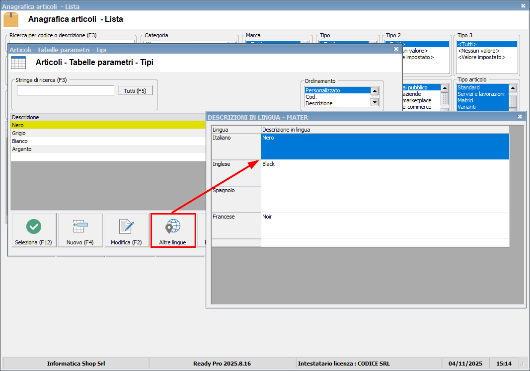 Relativamente alle varie tabelle personalizzabili, ove e' presente un campo gestibile in piu' lingue, queste saranno modificabili tramite il pulsante Altre lingue.