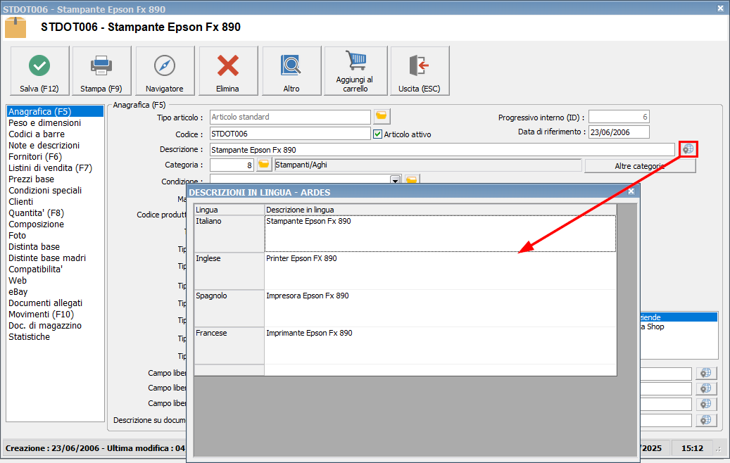 Con la gestione multilingua attiva, a fianco di ogni campo per cui e' prevista la possibilita' di inserire una descrizione in piu' lingue, comparira' un pulsante che consentira' di modificare tali descrizioni.