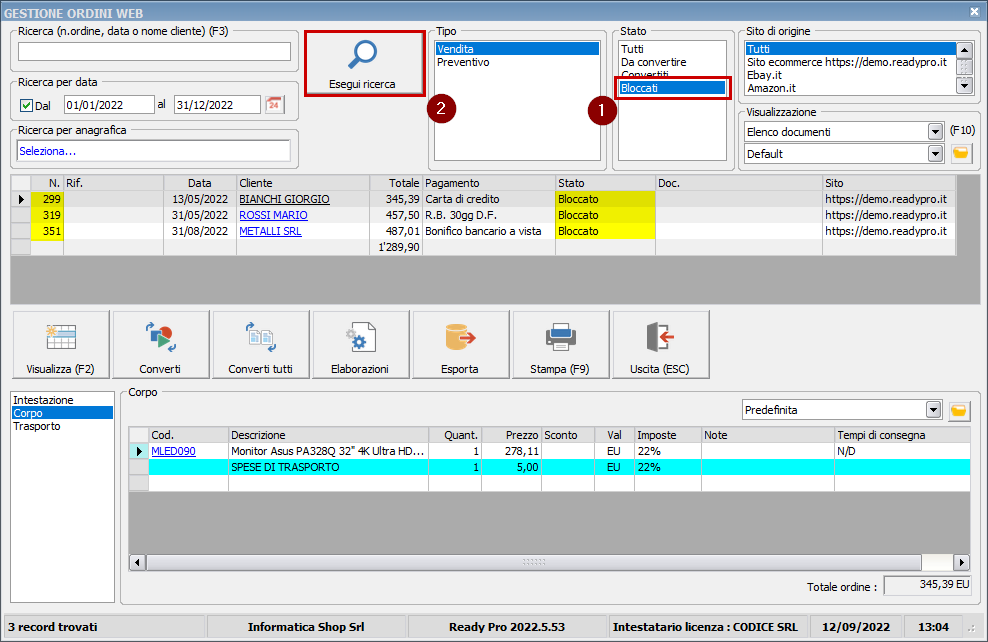 Gli ordini bloccati appariranno nella lista ordini attivando il filtro stato “Bloccati”.