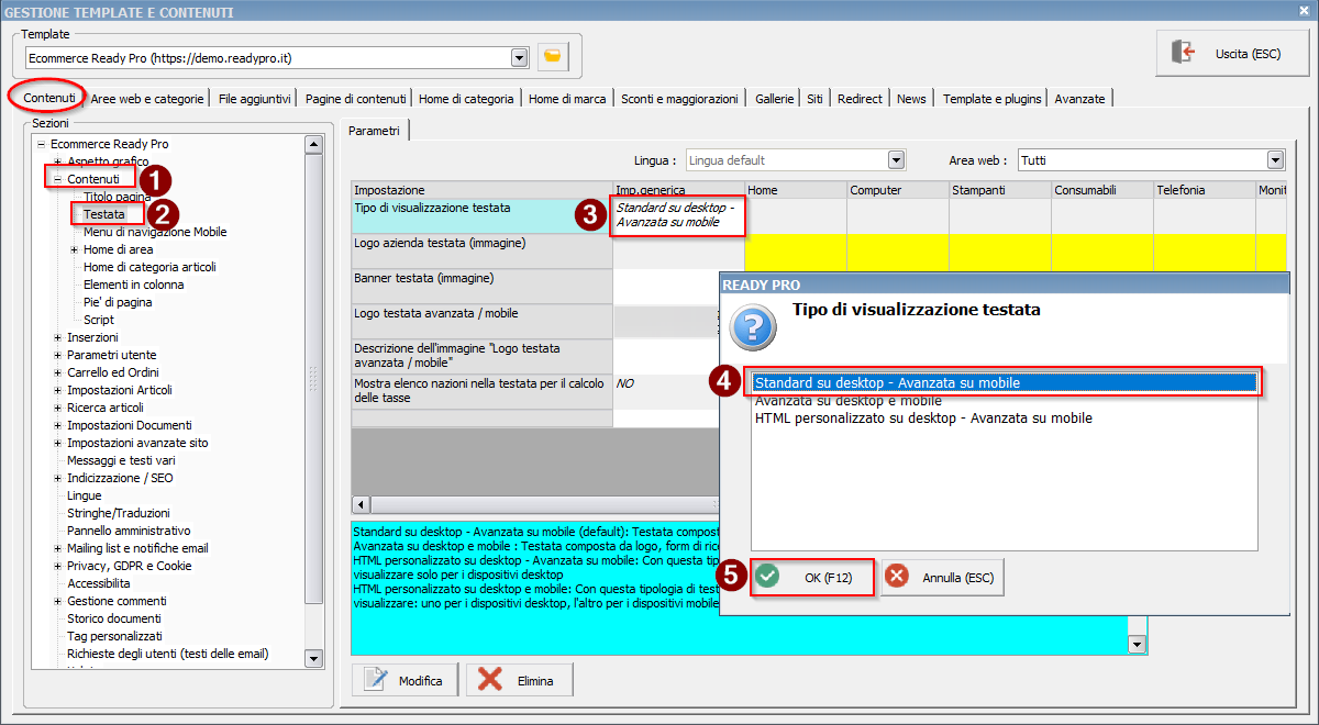 La visualizzazione Standard sarò attiva solo per la modalità desktop mentre invece nei dispositivi mobili la testata verrà visualizzata sempre in modalità avanzata.