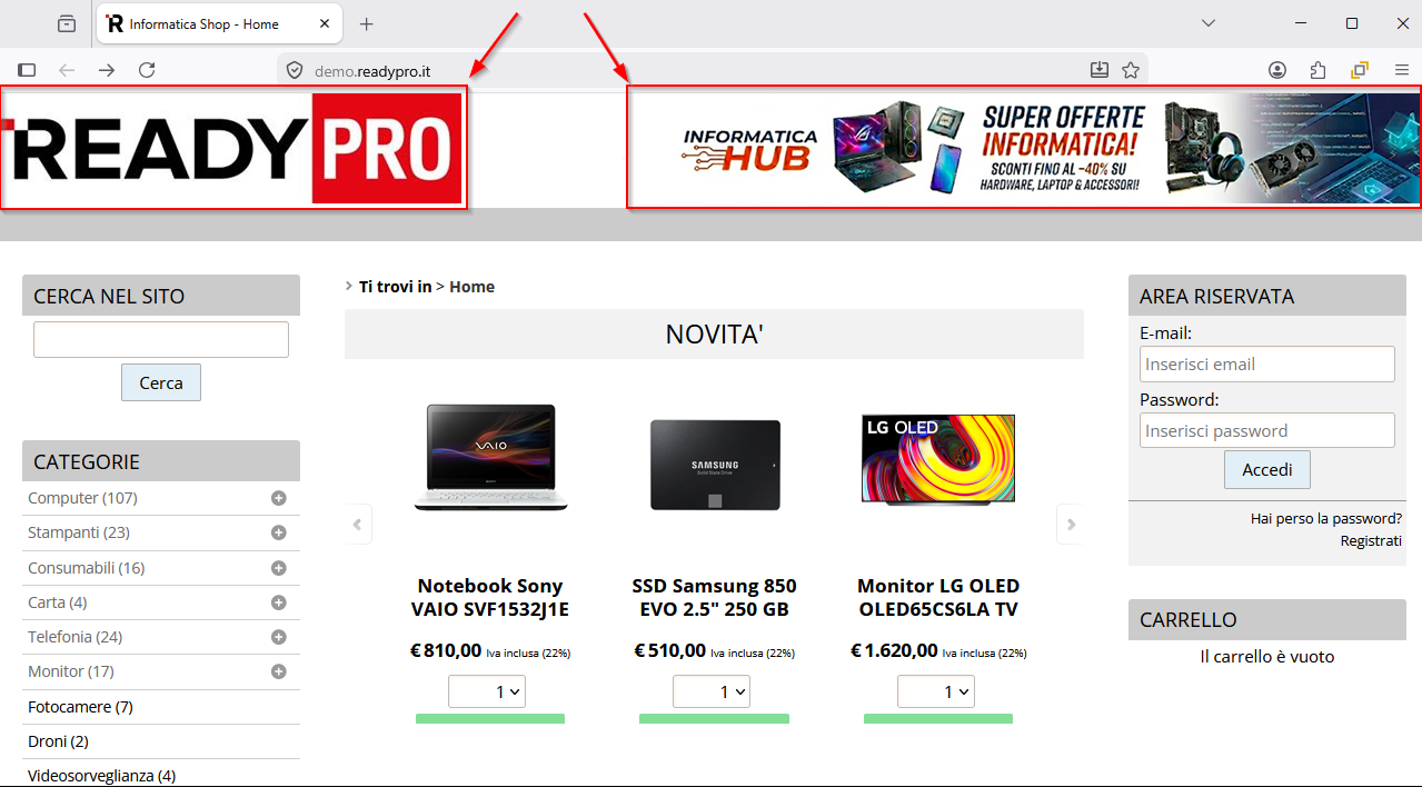 All'interno del modulo WEB di Ready Pro, la gestione della Testata Standard permette di configurare in modo semplice e intuitivo solo gli elementi grafici principali, come il logo aziendale e i banner pubblicitari o informativi, senza altri elementi come orm di ricerca, pulsante login e carrello.