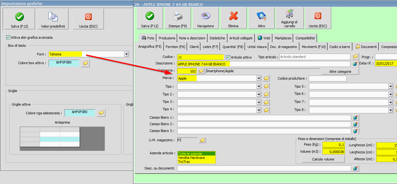 Dal menù File / Impostazioni grafiche è possibile anche cambiare tipo di font per i box di testo e i colori dei box attivi e delle righe selezionate per griglie attive e non attive.