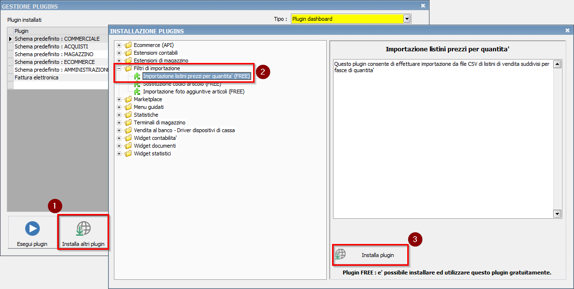 Il plugin è installabile tramite la consueta procedura dal percorso Filtri di importazione / Importazione listini prezzi per quantità.