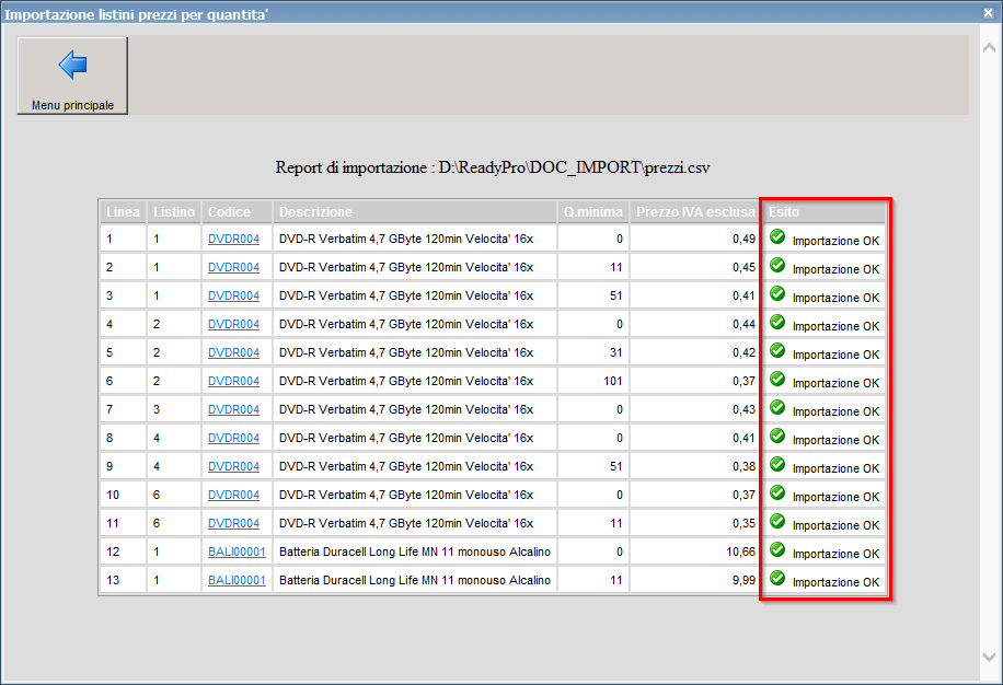 Al termine dell'importazione, verrà visualizzato un report di riepilogo dell'operazione effettuata per ogni fascia di prezzo di ogni listino.