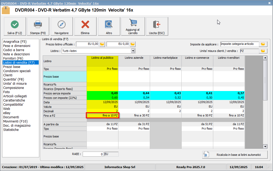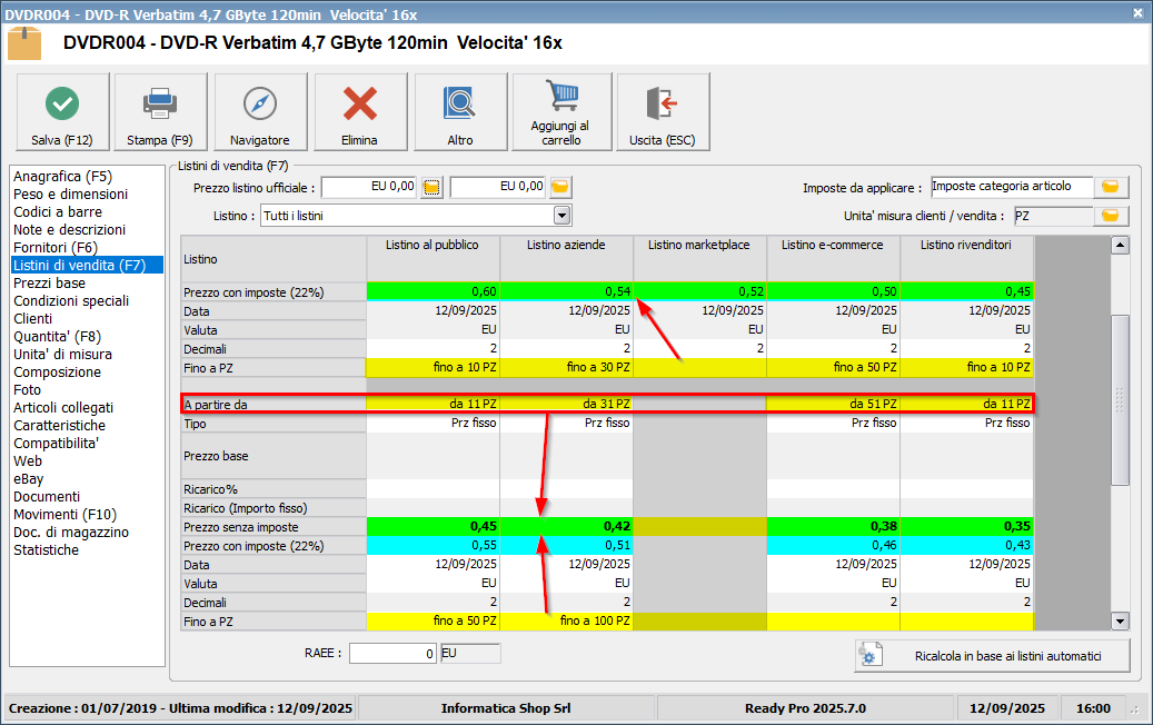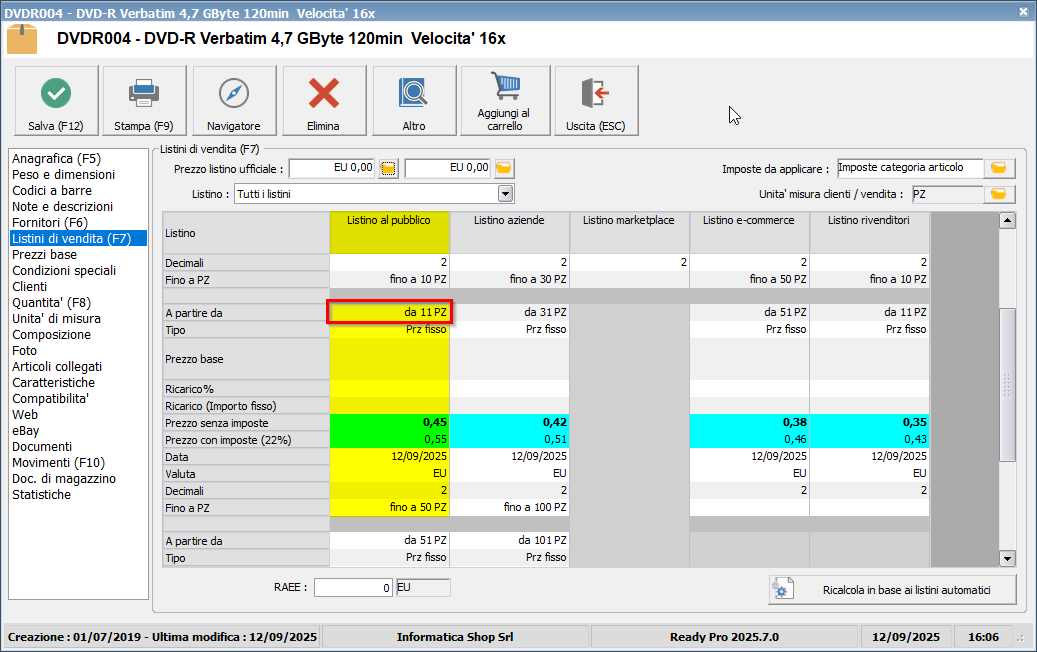 Per la successiva fascia di prezzo A partire da 11 pezzi del Listino al pubblico (1), indicheremo nel campo Quantità minima il valore 11.