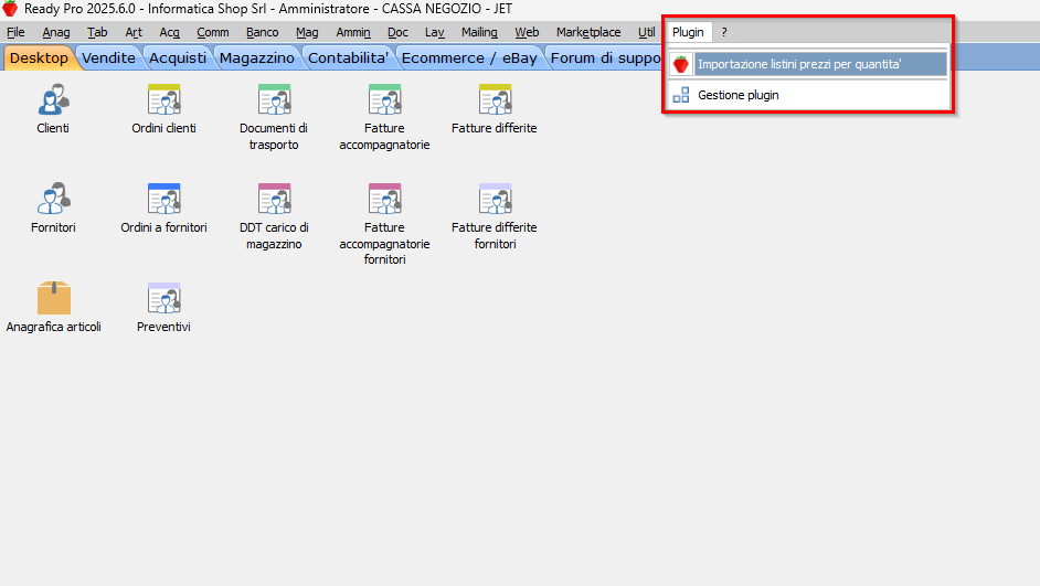Il plugin di importazione dei listini prezzi è accessibile dal menu Plugin / Importazione listini prezzi per quantità.