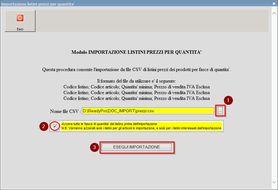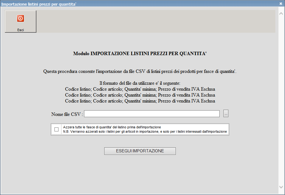 Una volta selezionato il file CSV da importare è possibile attivare eventualmente l'opzione che consente di azzerare le fasce di quantità di listino prima dell'importazione.