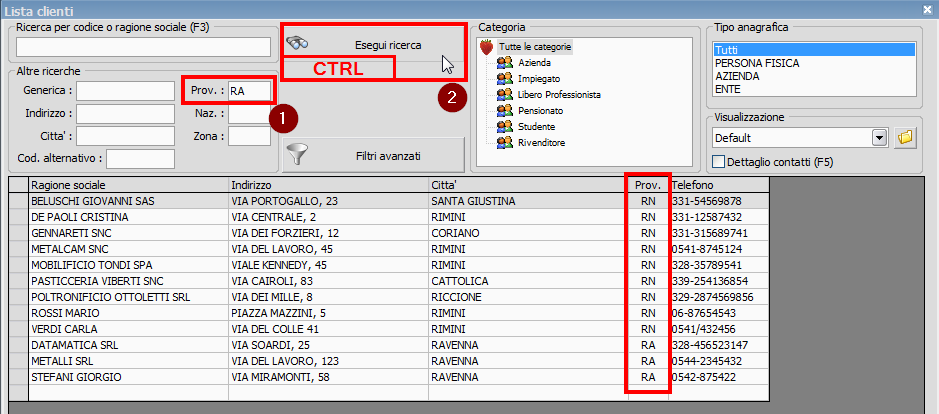 Poi impostiamo il filtro di ricerca Provincia = RA e teniamo premuto di il tasto CTRL mentre clicchiamo sul pulsante Esegui Ricerca.