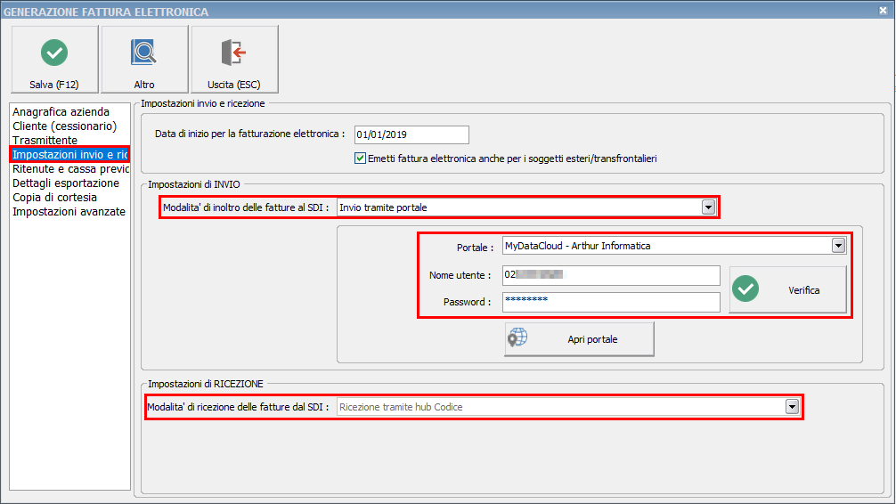 Innanzi tutto occorre attivare, nelle Impostazioni predefinite del plugin FE, la modalità di inoltro e ricezione delle FE al / dal SDI, attivando il portale dei servizi MyDataCloud e inserendo le credenziali di accesso in proprio possesso.