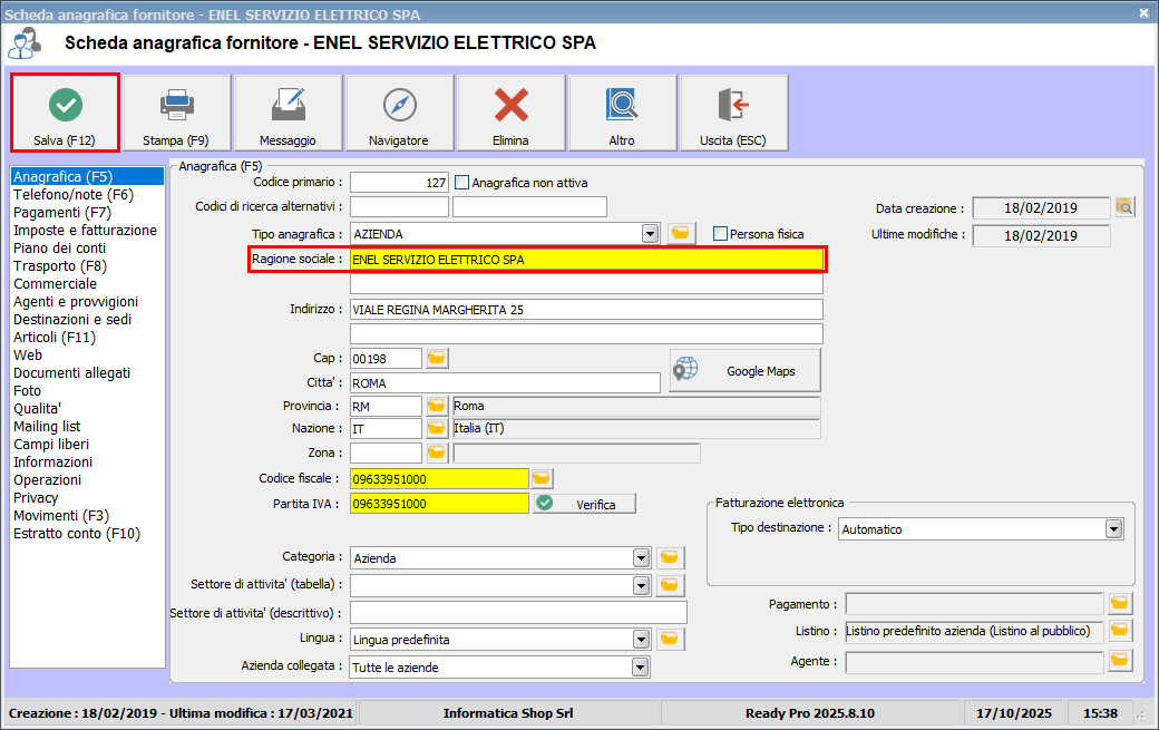 Se si fosse trattato di un fornitore già codificato in precedenza, Ready Pro ci avrebbe automaticamente proposto di utilizzare una anagrafica già esistente, avendola identificata dalla ragione sociale o dalla partita iva.