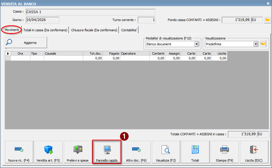 Per accedere al Pannello rapido utilizziamo l'apposito pulsante all'interno di una registrazione di cassa del giorno
