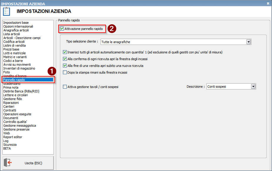 Per attivare la procedura Pannello rapido all'interno della procedura vendita al banco, è necessario abilitare l'opzione Attivazione pannello rapido dal menu Util / Impostazioni Azienda / Pannello rapido.