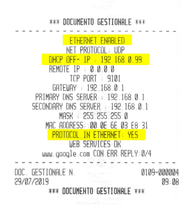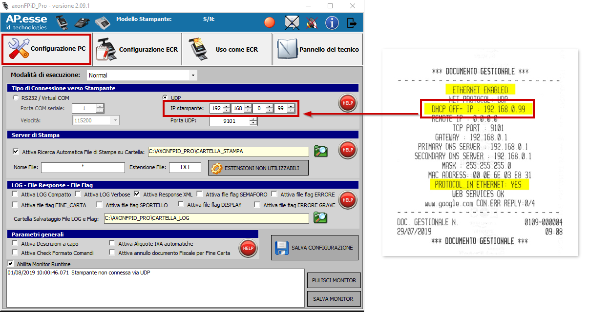 L'indirizzo IP (nel nostro esempio 192.168.0.99) che vediamo nel riepilogo stampato, andrà quindi impostato all'interno dell'applicazione Windows Axon FPID Pro.