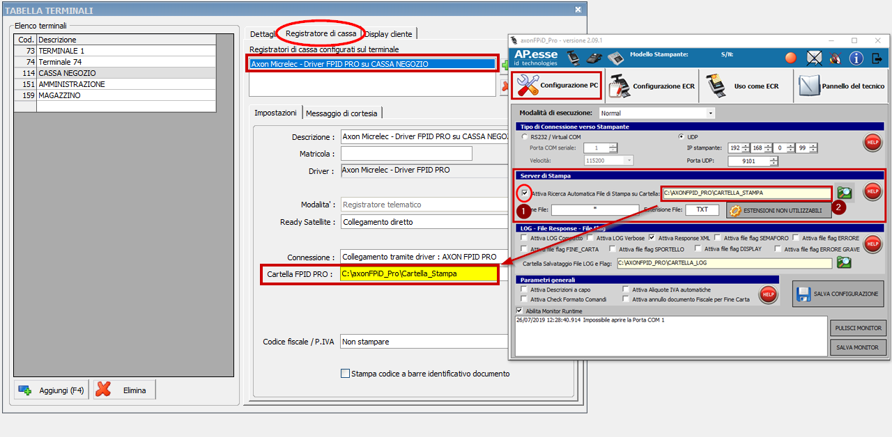 Configuriamo il driver del registratore di cassa all'interno Ready Pro nella tabella Terminali / Registratore di cassa