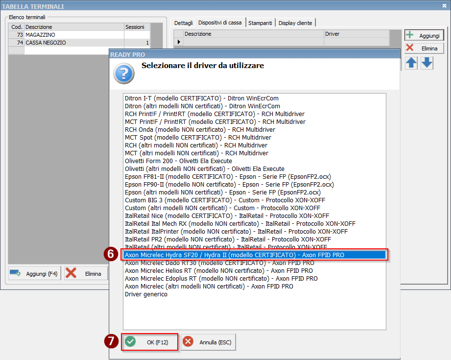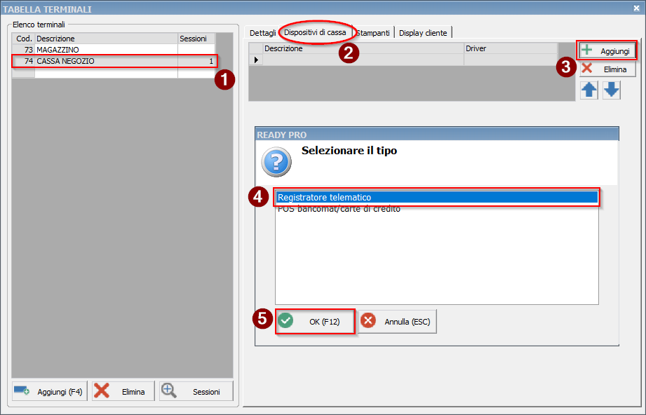 Selezioniamo il terminale dall'elenco e aggiungiamo il driver scegliendo poi l'opzione Registratore telematico