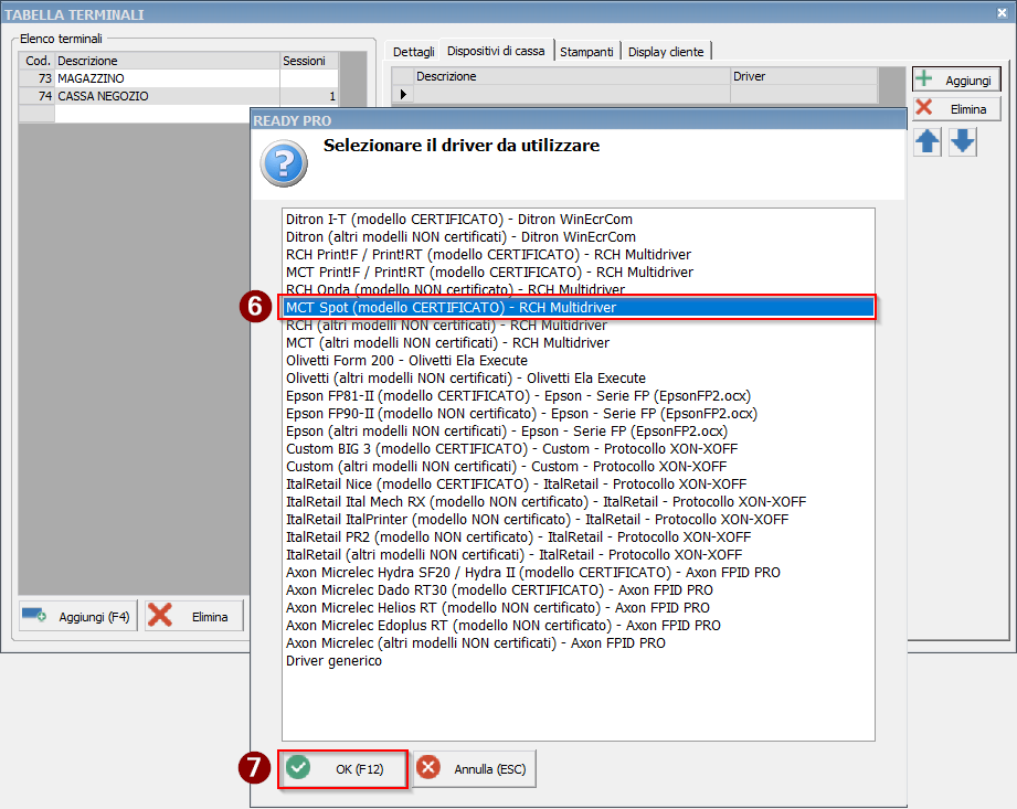 Selezioniamo il terminale dall'elenco e aggiungiamo il driver scegliendo poi l'opzione Registratore telematico.