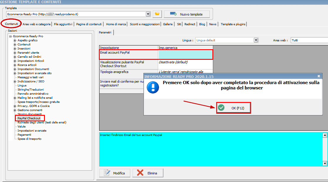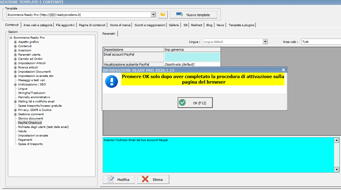 Da notare che nel frattempo, nella procedura Gestione template e contenuti di Ready Pro, è apparsa una finestra di avviso che NON bisogna confermare fino a che non si è completata l'intera procedura di attivazione sulla pagina del browser.