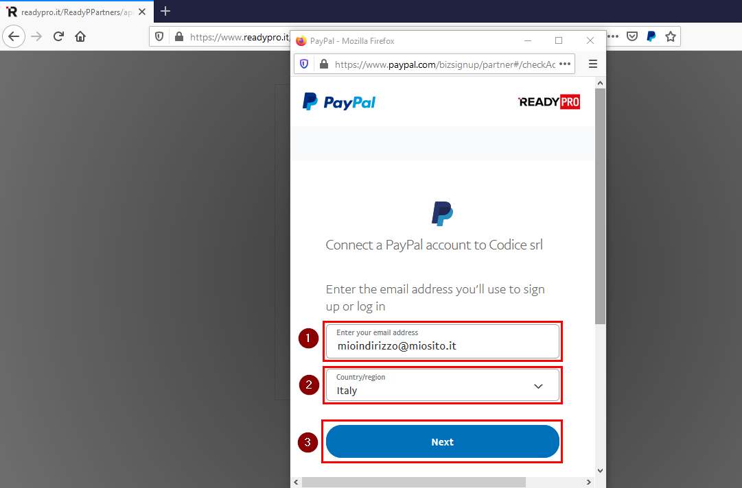 Procedendo con l'attivazione, viene aperta una nuova finestra direttamente sul sito di PayPal, dove viene richiesto di inserire nuovamente l'indirizzo email del proprio account e il paese di provenienza.