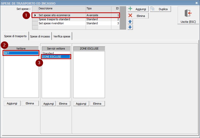 Per inserire una eccezione di esclusione per alcune zone, occorre selezionare il vettore e il parametro ZONE ESCLUSE che si trova nella sezione Servizi vettori.