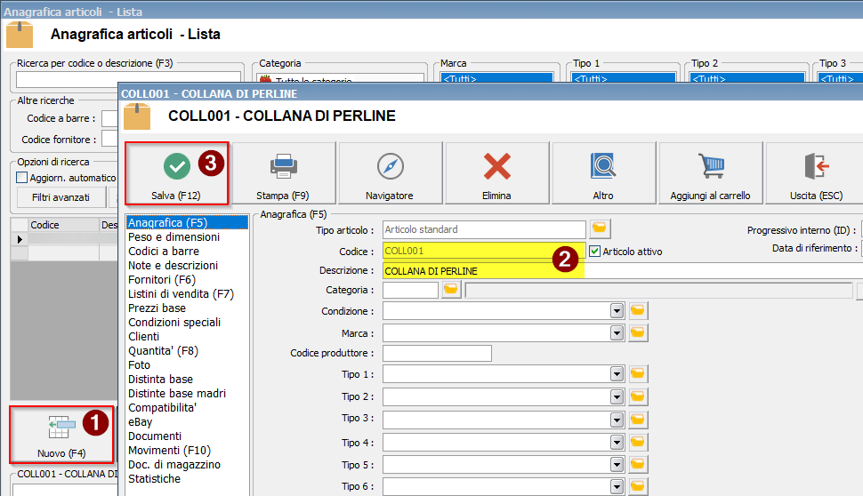 Iniziamo con il creare un nuovo articolo "Collana di perline" nello stesso modo in cui creeremmo qualsiasi altro articolo: