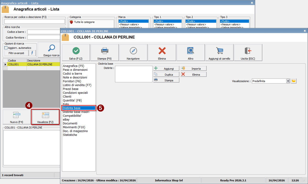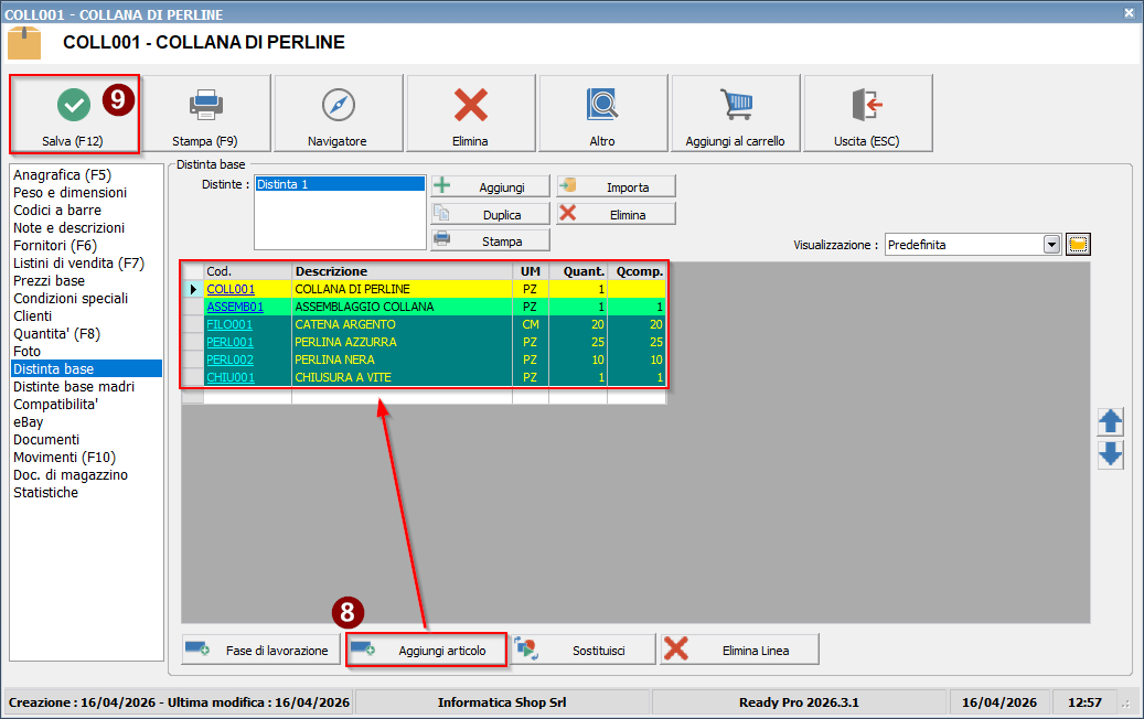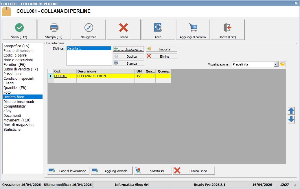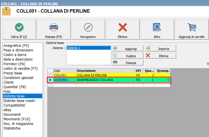 La distinta base viene automaticamente creata con evidenziato in giallo la testa della distinta (che ovviamente contiene l'articolo Collana di perline che dobbiamo descrivere).