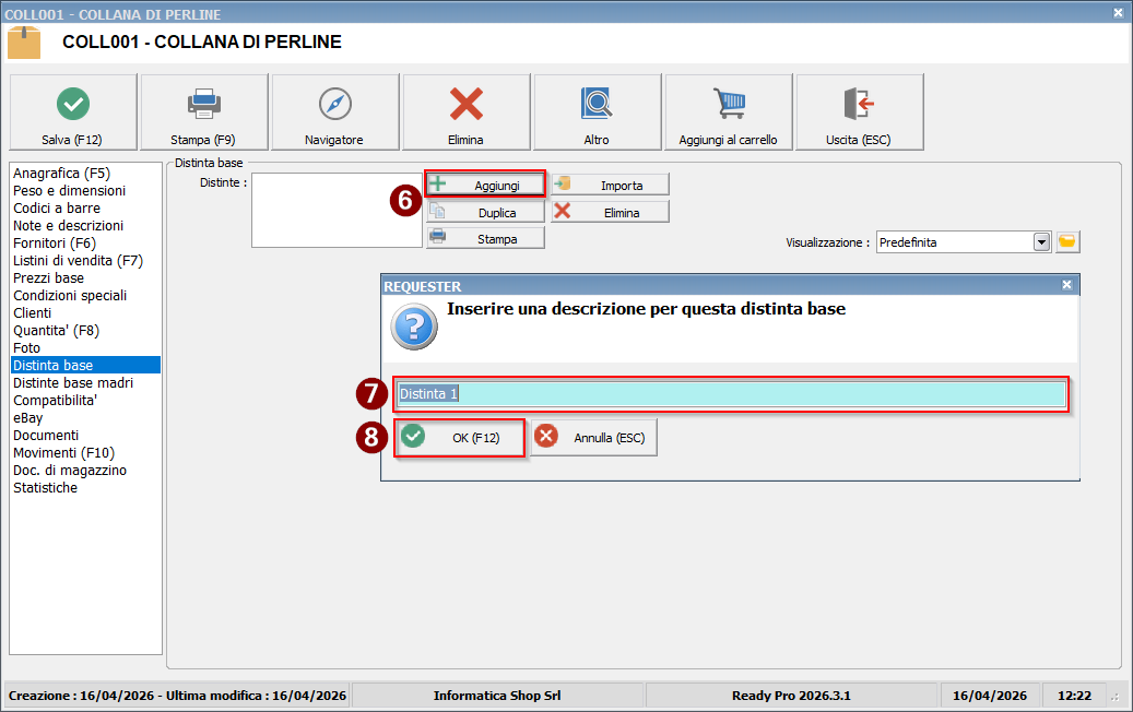 Verra' richiesto di inserire una descrizione per la nuova distinta base, possiamo confermare il nome che viene proposto in automatico
