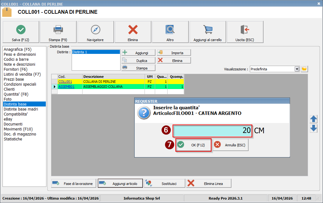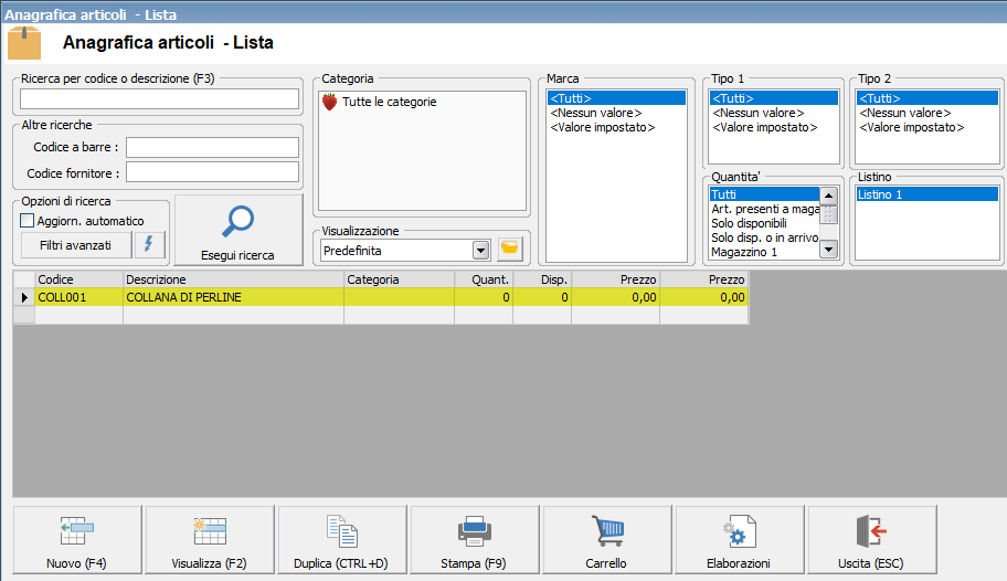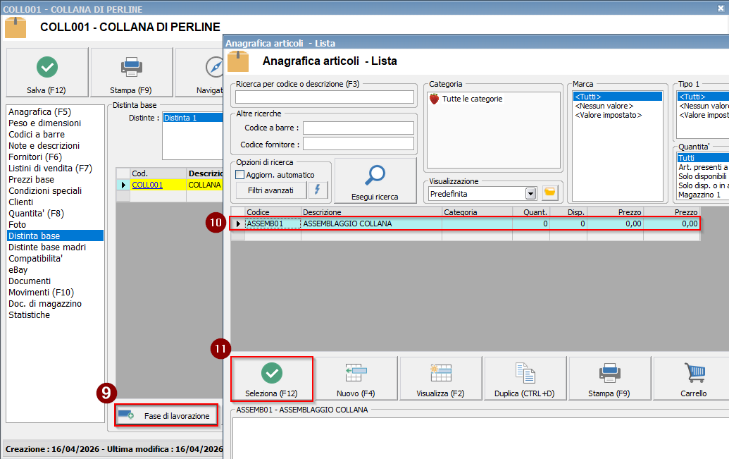N.B. In questo esempio, per semplicita', si suppone che gli articoli "catena argento", "perline azzurre", ecc. siano gia' stati creati in precedenza. Per una descrizione di come creare degli articoli standard fare riferimento alla sezione scheda anagrafica articoli