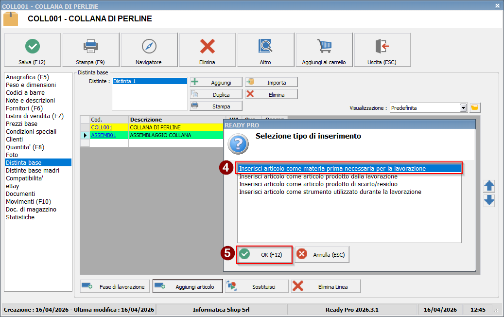 Si aprira' un nuovo requester da qui selezioniamo la prima opzione Inserisci articolo come materia prima... e confermiamo.