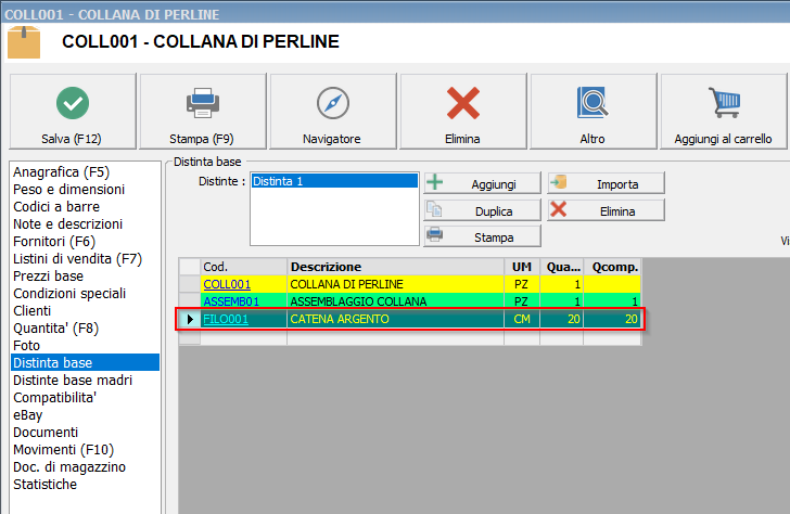 A questo punto saremo tornati alla distinta base con aggiunto il componente Catena argento evidenziato in giallo su sfondo verde scuro.