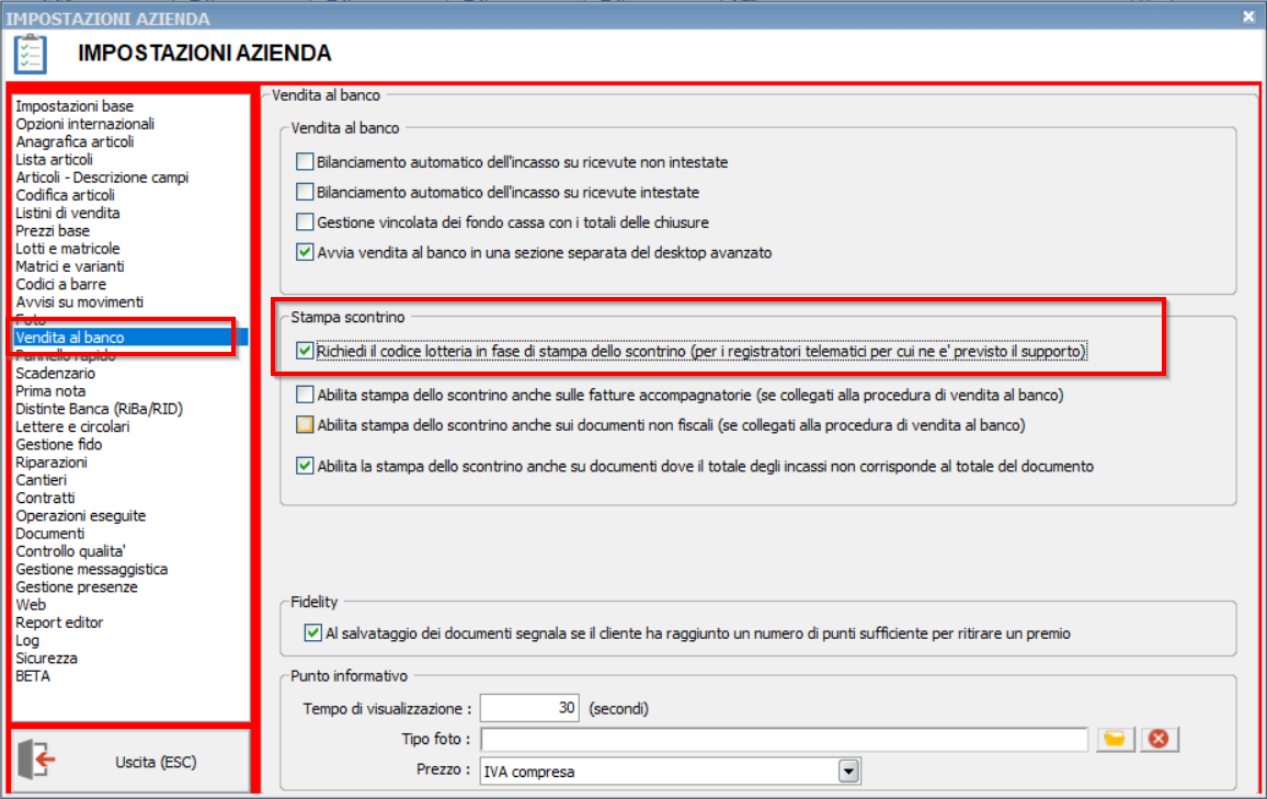 Una volta attivata l'opzione, facciamo un semplice esempio partendo dalla procedura di Vendita al banco, e da un documento di vendita non intestato: premendo il pulsante di stampa Scontrino viene mostrato in questo caso un menù di selezione del tipo di stampa, da cui possiamo selezionare l'opzione “Inserire il codice lotteria”.