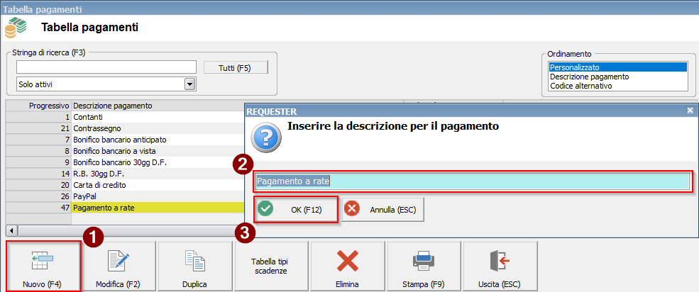 Dopo aver installato il plugin occorre creare il nuovo tipo di pagamento rateale nella tabella pagamenti.