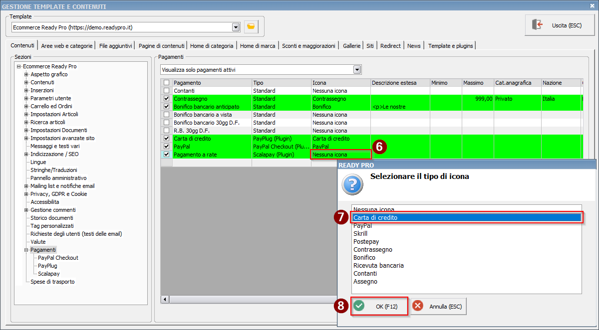 Possiamo eventualmente impostare i tipo di icona che apparirà nel carrello: in questo caso possiamo selezionare Carta di credito.