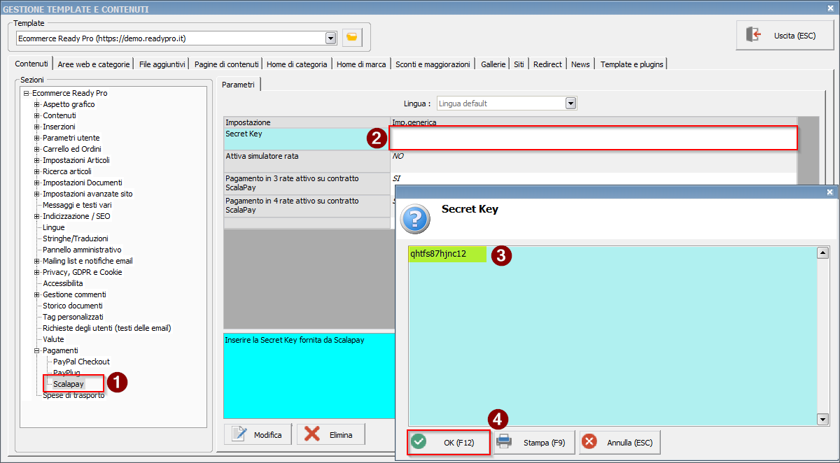 A questo punto andiamo a configurare i principali parametri di servizio all'interno dell'impostazione plugin: prima di tutto inseriamo la Secret Key che viene fornita direttamente dal backoffice Scalapay al momento dell'iscrizione.