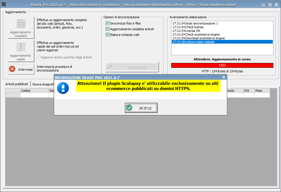 N.B. Il plugin Scalapay è utilizzabile esclusivamente su siti ecommerce pubblicati su domini HTTPS. in caso contrario verrà visualizzato al momento della sincronizzazione un messaggio di avviso simile al seguente: