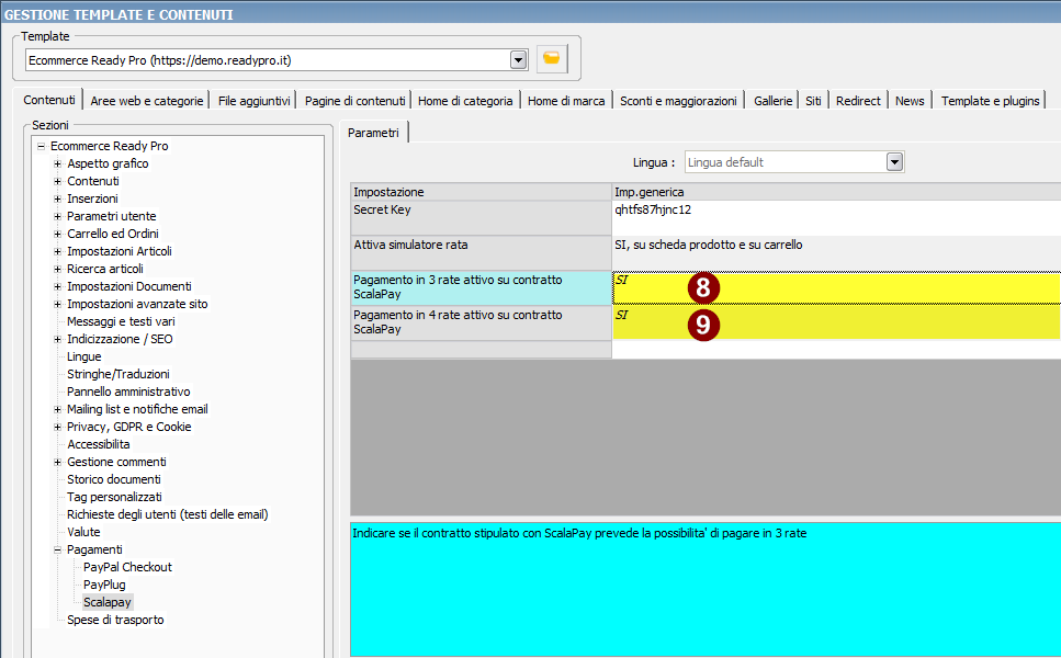 Le altre impostazioni consentono di visualizzare il simulatore rata, in base al contratto stipulato dal merchant con ScalaPay che prevede la possibilita' di pagare in 3 e/o 4 rate (entrambe attive di default).