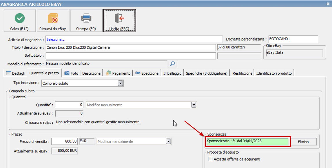 In questo modo, l’inserzione verrà già impostata come sponsorizzata su eBay senza doverla aggiornare.