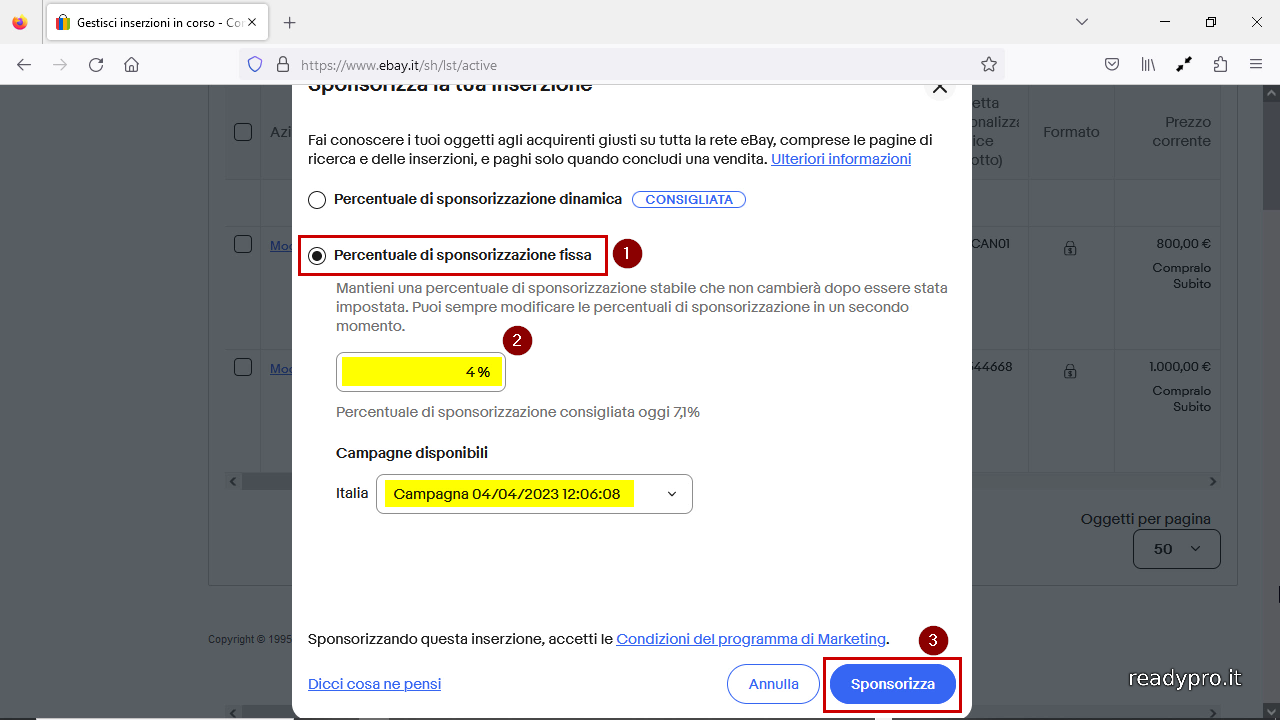 eBay prevede essenzialmente 2 tipi di sponsorizzazione delle inserzioni: uno basato su un costo per click utente che però non viene supportato attualmente da Ready Pro, e l’altro invece basato su una percentuale di sponsorizzazione ovvero una percentuale di commissioni extra da riconoscere a eBay in caso di vendita dell’articolo, chiamato tecnicamente “cost per sale”.