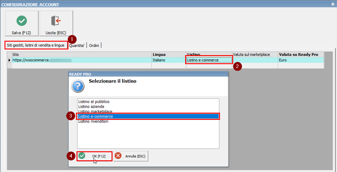 Ad esempio, dal tab Siti gestiti, listini di vendita e lingue, è possibile scegliere il tipo di listino da utilizzare per i siti ecommerce