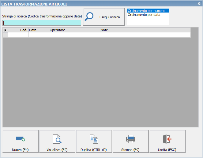 Questa procedura, utilizzabile dalle piccole realtà che effettuano lavorazioni sugli articoli, consente di trasformare degli articoli (scaricandoli dal magazzino) in nuovi articoli (effettuando quindi un carico automatico dei nuovi prodotti).