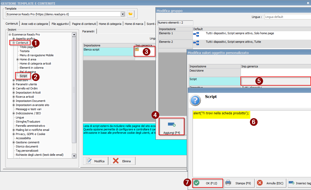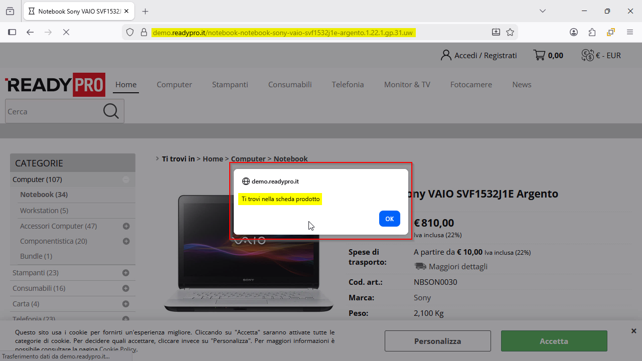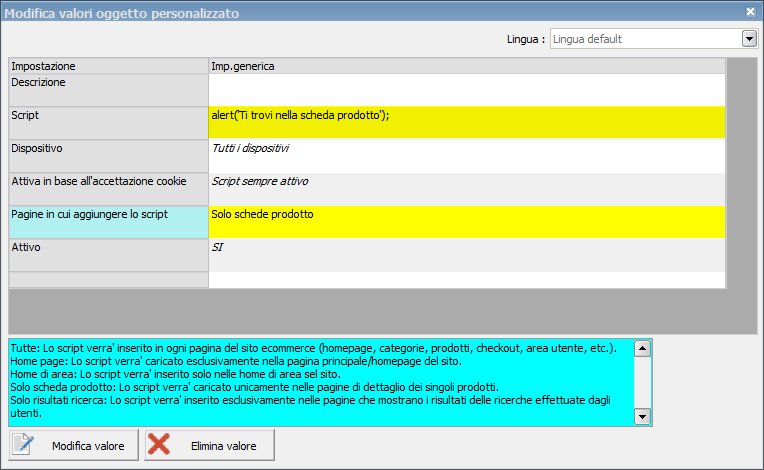 Vediamo come aggiungere un nuovo script che visualizza un messaggio quando ci si trova all’interno della scheda prodotto, nel nostro caso una semplice istruzione che mostrerà un avviso a schermo.