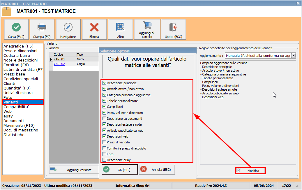 All'interno della gestione degli articoli matrice e varianti, una delle funzionalità più importanti riguarda la possibilità di replicare i listini di vendita dall'articolo "padre" (matrice) ai prodotti "figli" (varianti)