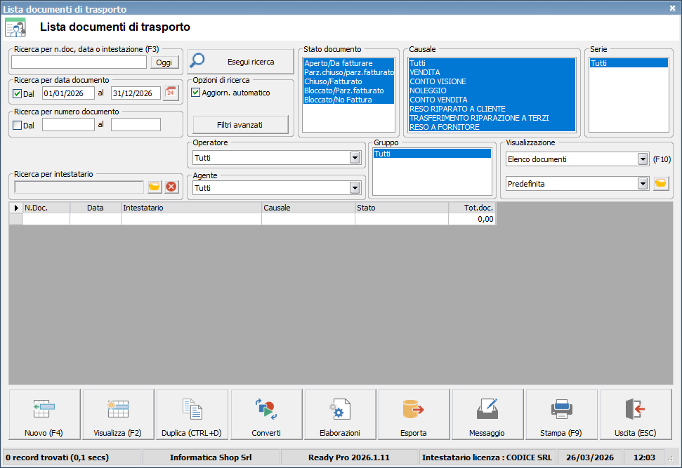 Quando si accede ad una procedura di gestione documenti comparirà una finestra simile a quella sotto riportata (l'esempio riguarda l'elenco documenti di trasporto ma l'utilizzo e' lo stesso per ordini, preventivi, fatture, ecc.).