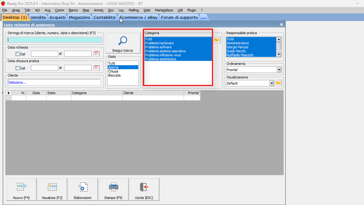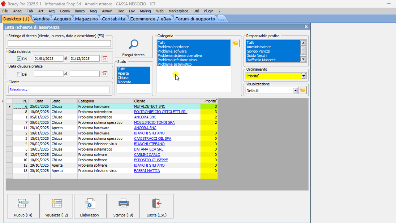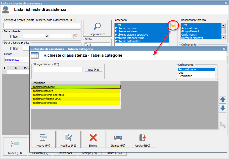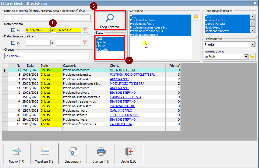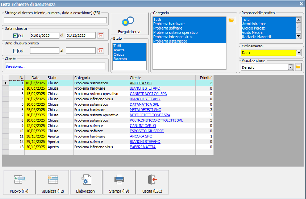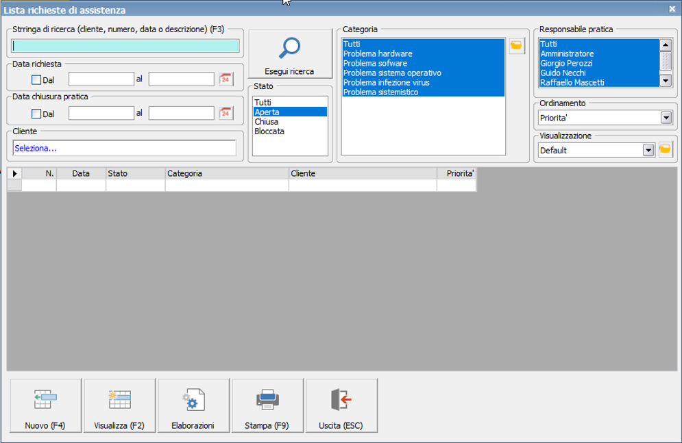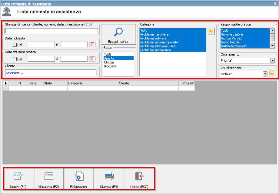 Nella zona superiore sono presenti i filtri di ricerca utili quando si è in presenza di numerose richieste di assistenza oppure quando si vuole ricercare nello storico (le richieste di assistenza anche una volta chiuse rimangono comunque in archivio).