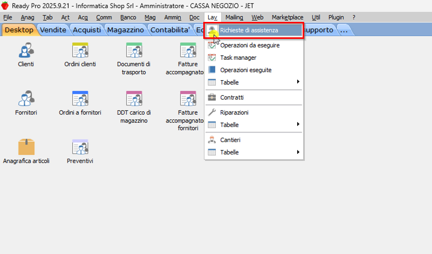 Per accedere alla procedura Richieste di assistenza, apriamo il menu Lavorazioni.