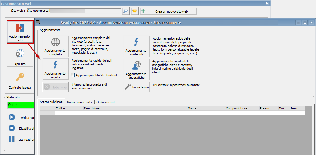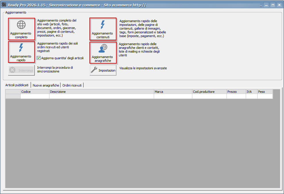 - Aggiornamento rapido: aggiorna in modo rapido i soli ordini ricevuti e i nuovi utenti registrati sul sito; l'attivazione di una speciale opzione permette anche di aggiornare la quantità degli articoli