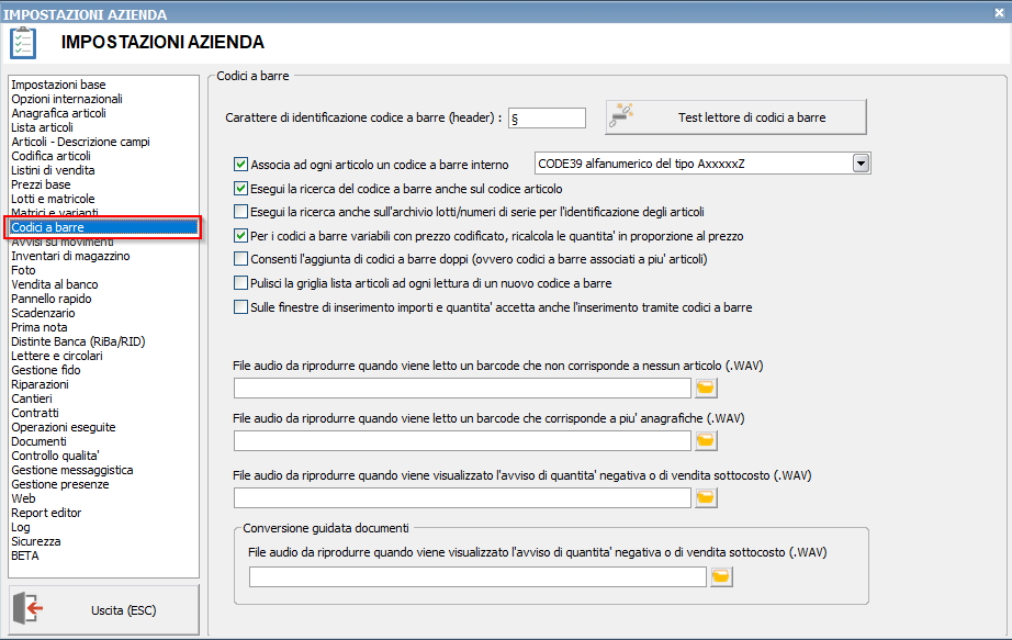 Questa sezione permette di impostare le opzioni inerenti al lettore di codici a barre per un corretto utilizzo con Ready Pro.