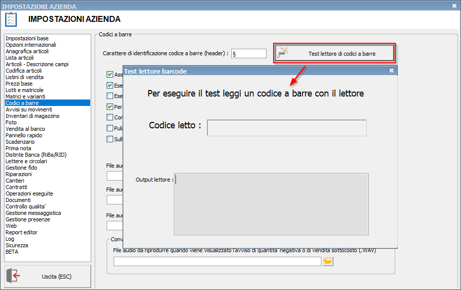 Immediatamente a destra della scritta Carattere di identificazione codice a barre (header) è presente il pulsante Test lettore di codici a barre che attiva la procedura di verifica delle impostazioni del lettore.
